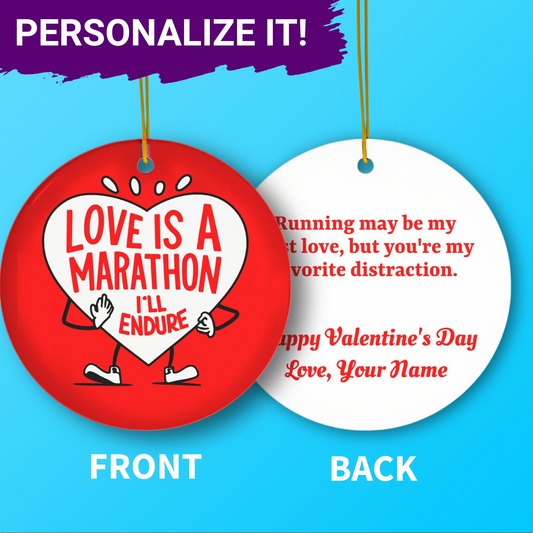 Marathon Running Ornament, "Love is a Marathon", 3 in Ceramic