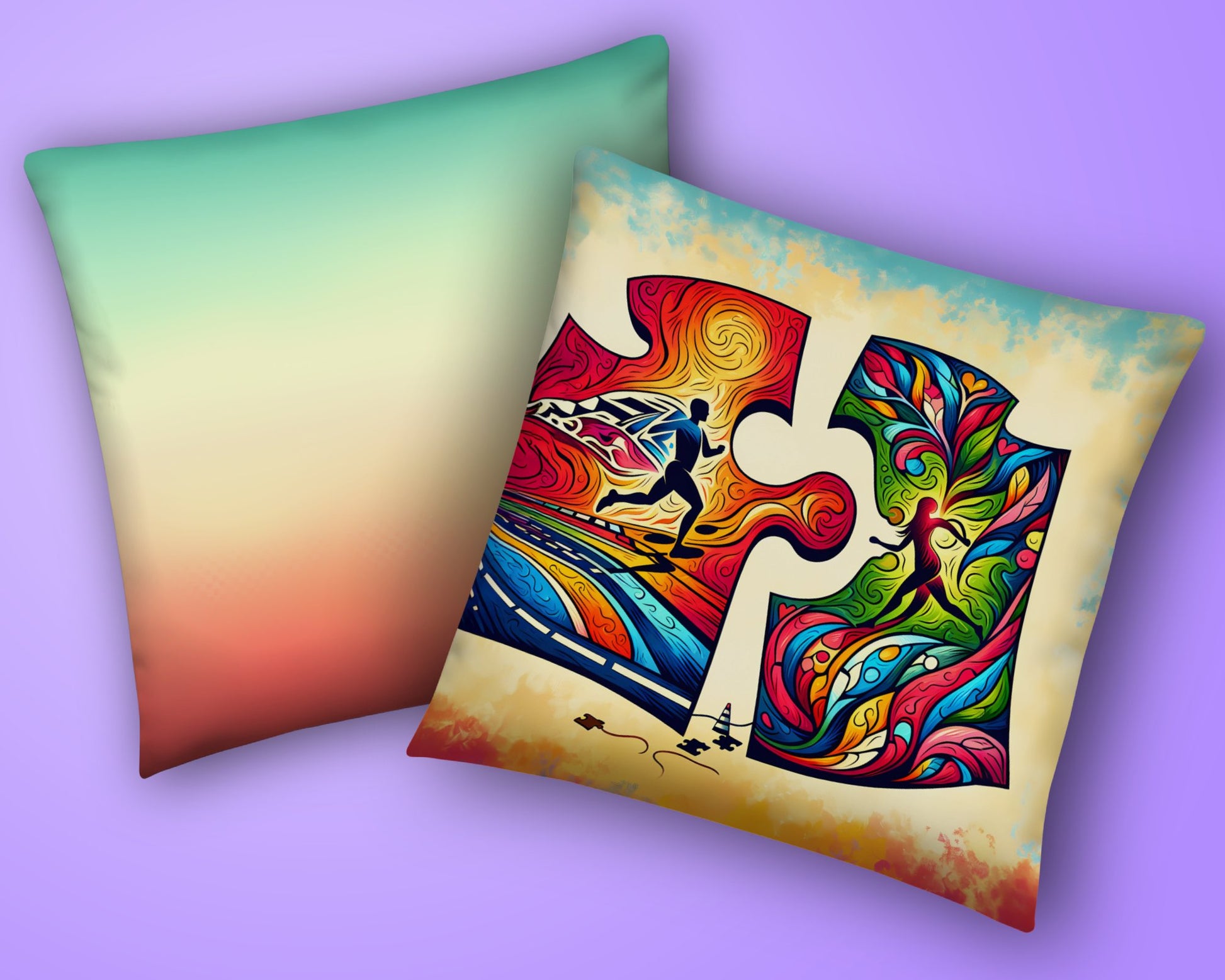 Elevate the ambiance of your living space with vibrant colors and pure love, courtesy of our striking abstract running couple pillow. This exquisitely crafted, handmade pillow makes for the perfect gift for avid runners, adding a touch of style and unparalleled comfort to any room. Treat yourself to the ultimate indulgent experience with this unique and personalized pillow.