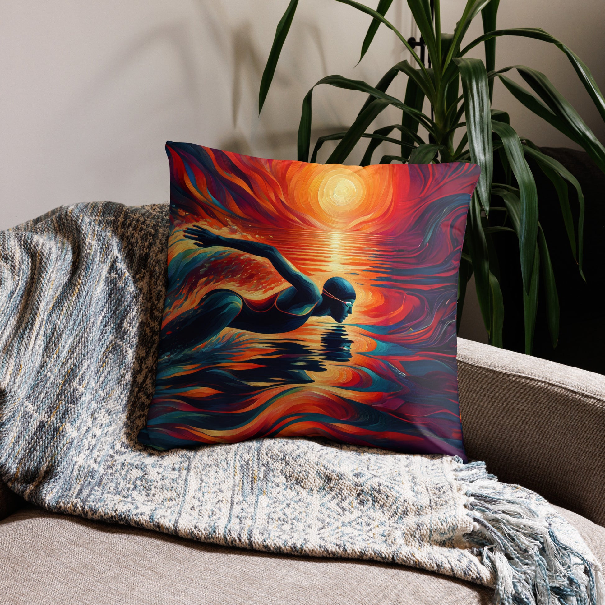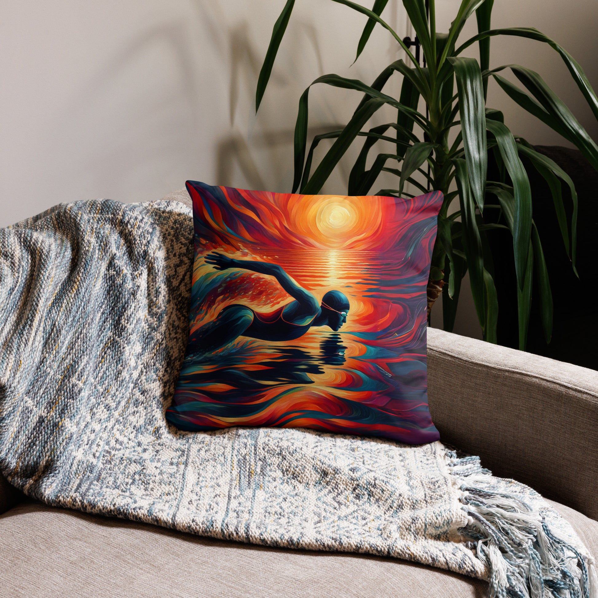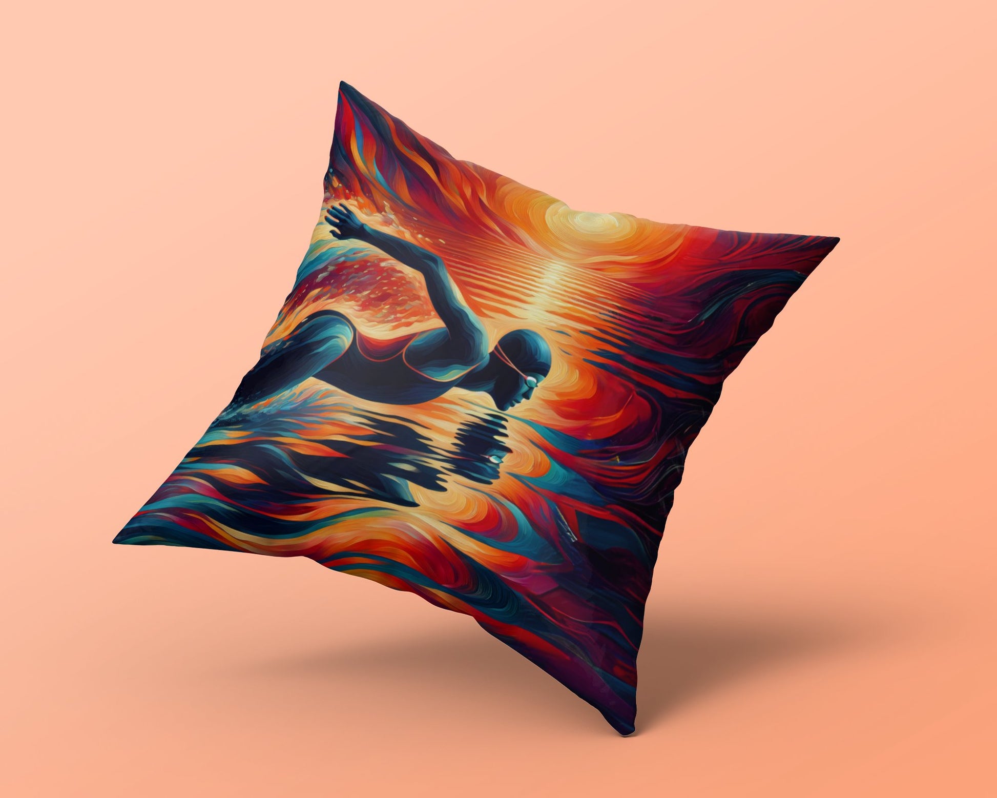 Vibrant abstract swimmer art pillow. Perfect for swim enthusiasts. Soft and durable, adds a touch of artistic flair to any room. Ideal for living room couch, bedroom, or as a lovely splash of color. Individually printed, cut, and hand-sewn using prem