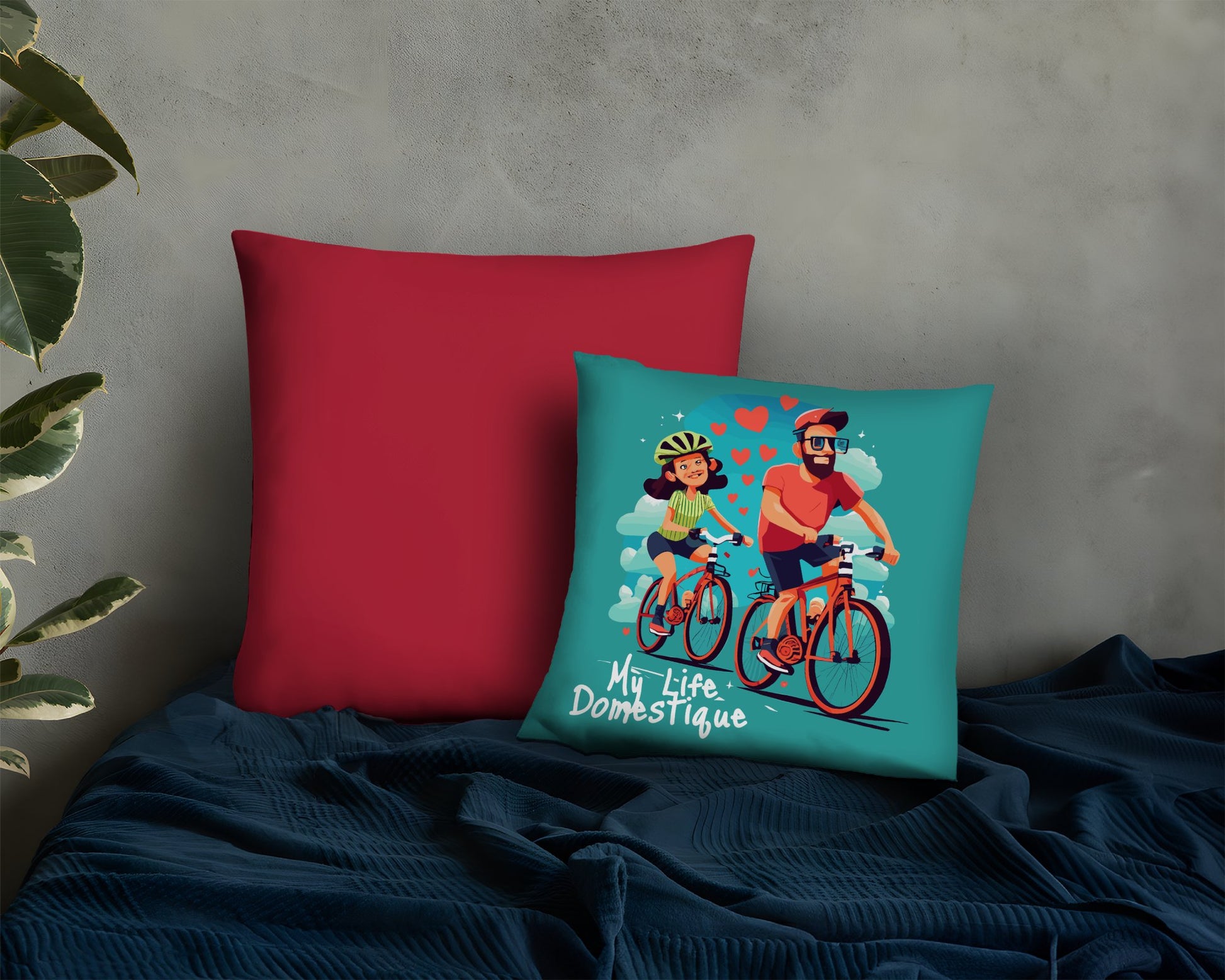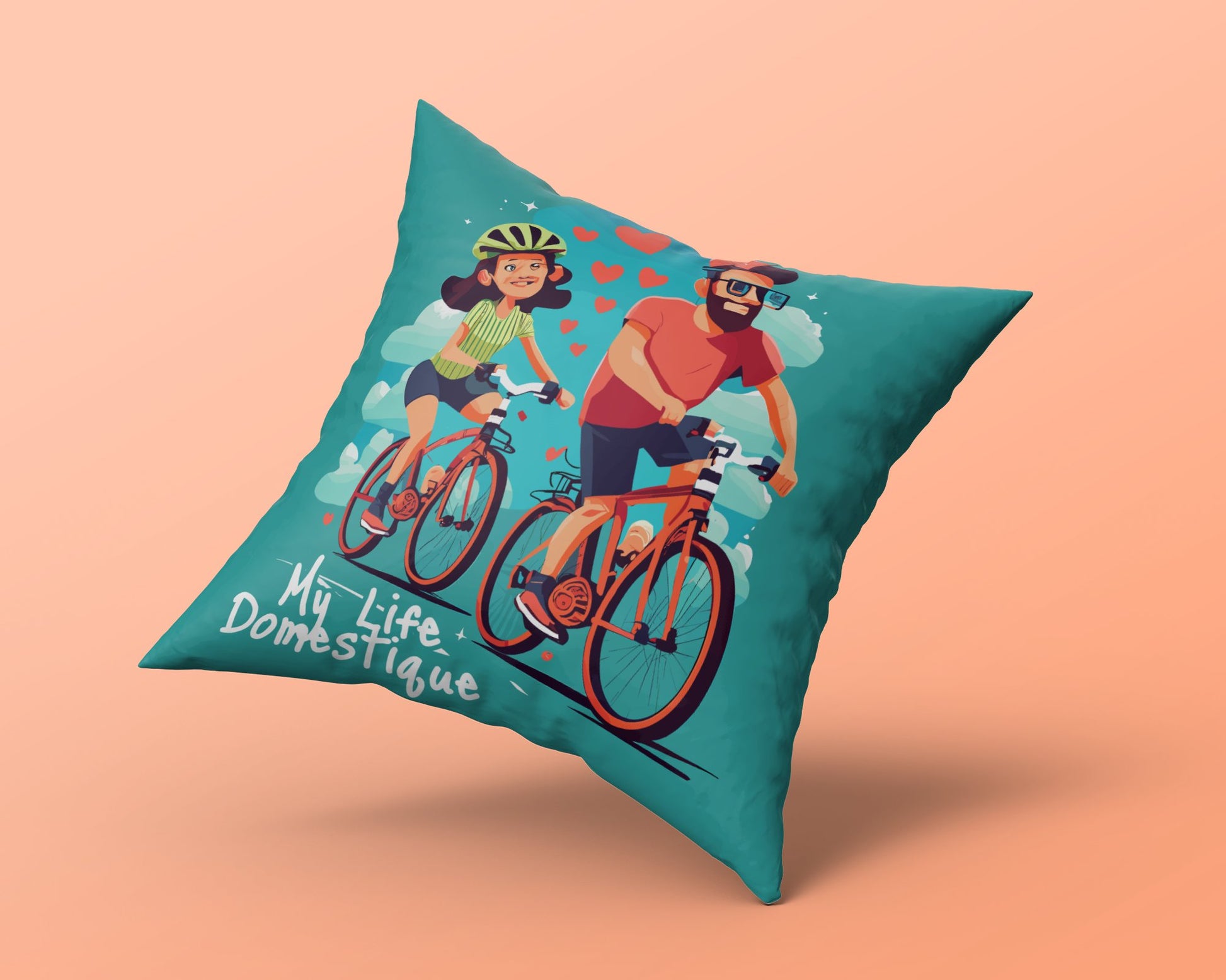 This charming Valentine's Day pillow showcases a delightful cartoon design of a joyful couple riding bicycles. It's a perfect present for the avid cyclist in your life or a unique addition to your home decor. The pillow offers durability, comfort, and delight.