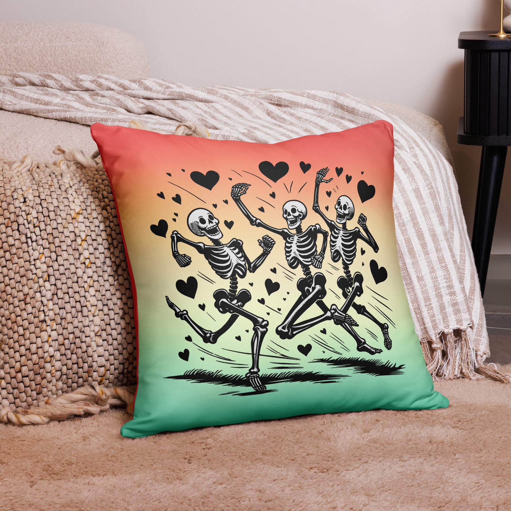 Enhance the ambiance of your home with this unique Running Skeleton pillow. Perfect for goth fans or those looking for an unconventional twist on Valentine's Day decor. This high-quality throw pillow features a vibrant image of a racing skeleton, sure to leave a lasting impression.