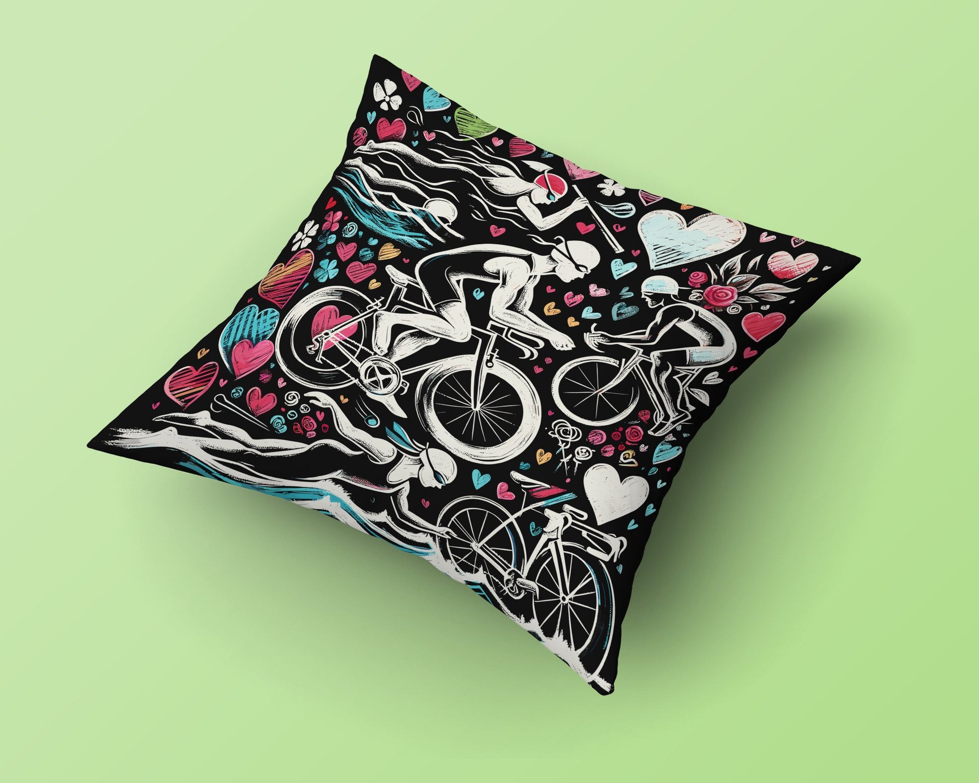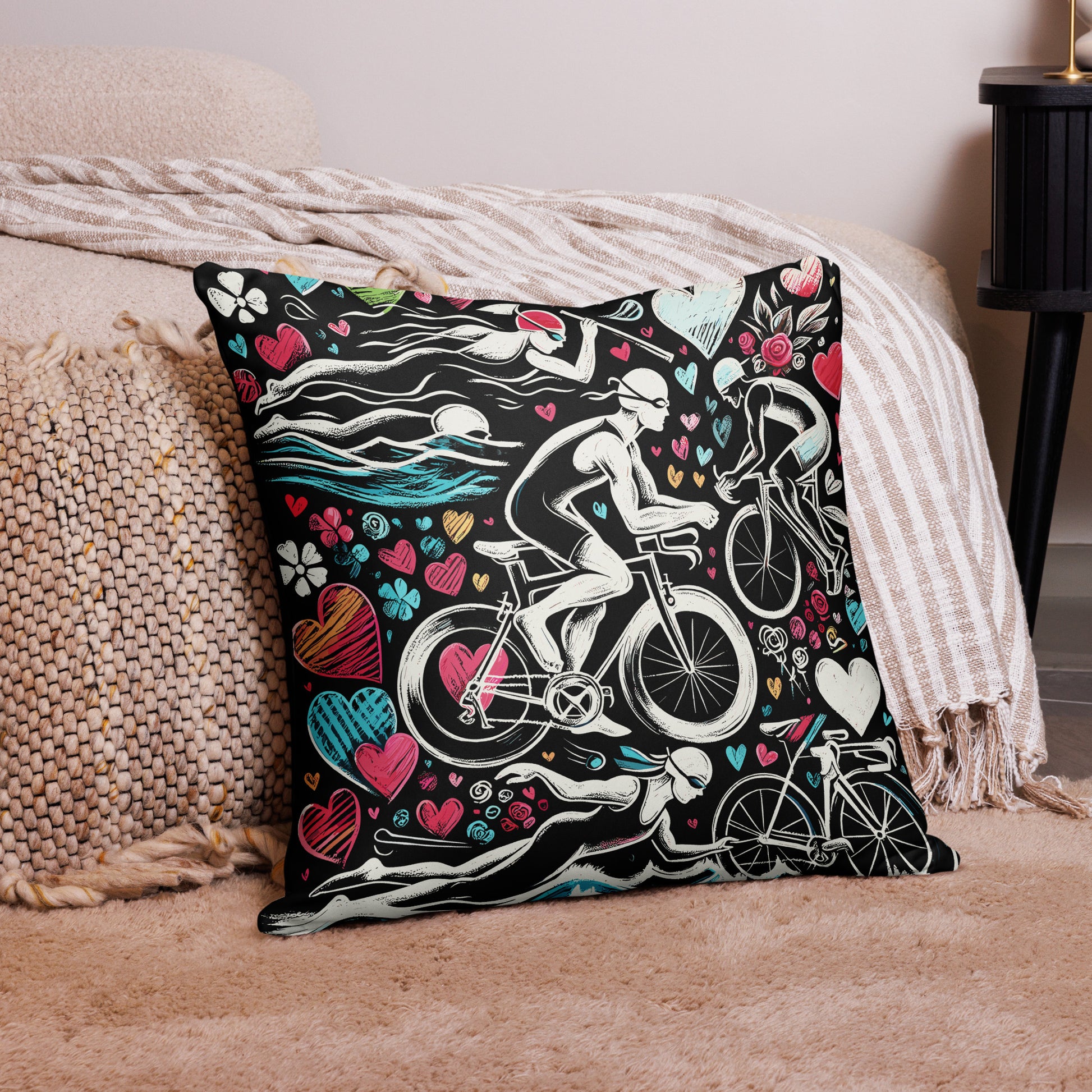 Unique triathlon-inspired pillow, perfect for adding a touch of romance and sporty style to any space. Ideal Valentine's Day gift or special present for any occasion to show your love and support for their athletic passion. Made from soft, durable ma