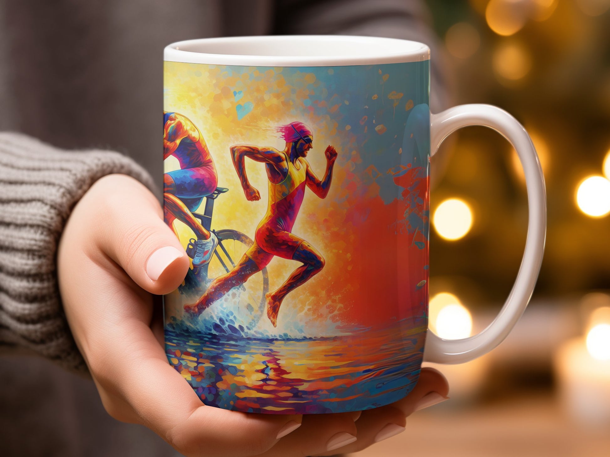 Colorful, durable Triathlon Mug for your favorite hot beverages! Triathlon Mug colorful swim bike run, 11 & 15 Enjoy your favorite hot beverages in style with this colorful and durable Triathlon Mug! Perfect for showing off your love for the swim, bike, and run. The 11 and 15-ounce options ensure you have the perfect amount of fuel to tackle your training or race day. Keep your drinks hot and your motivation high with the Triathlon Mug.
