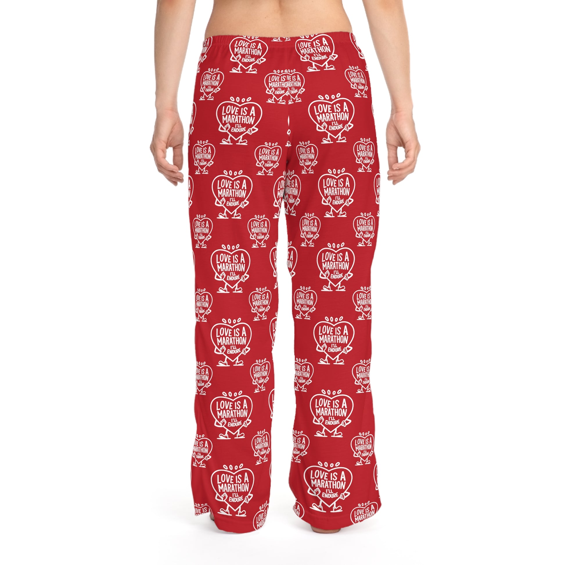 Cozy Valentine's Running Pajamas for running couples. Adorable "Love is a Marathon" graphic for comfort and style. Perfect for gift-giving and snuggling after runs. Proudly made in the USA.